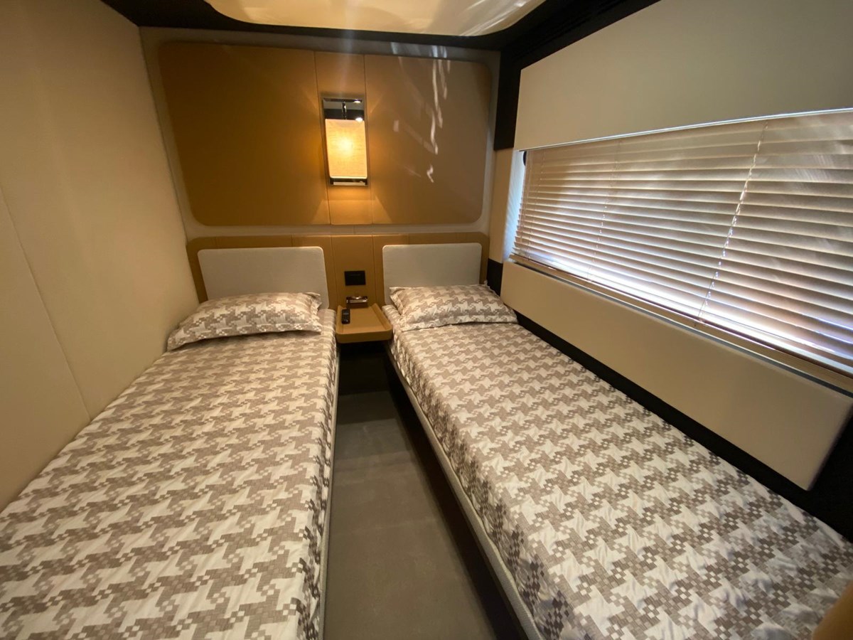 From the moment you approach this Azimut 77S, you’ll notice the streamlined lines and sport-fly silhouette that distinguish it from typical motor-yachts. Her triple IPS pod drives (by Volvo Penta) deliver responsive handling, efficient power and simplified docking. Large side windows and the optional hard-top sunroof flood the main deck with light and create a seamless indoor-outdoor connection. The aft cockpit transitions into a wide hydraulic swim platform, perfect for launching the tender or enjoying water sports. Forward you’ll find a generous bow lounge area for sunbathing or casual cocktails, and the flybridge serves as the ultimate vantage point for cruising or entertaining.