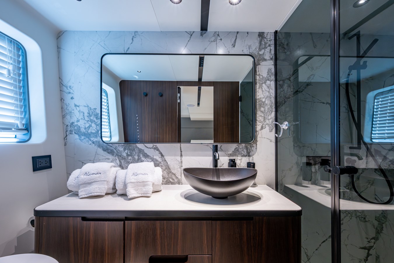 The Forward Stateroom also offers a generous amount of room for a yacht of this size, with an island queen and en-suite head that features beautiful stonework and a glass shower enclosure, guests will have a comfortable place to go at the end of the day. You will find dual night stands with USB and HDMI ports, a Samsung smart tv, storage under the bed, a hanging locker to port and Stbd, Sizeable widows with privacy blinds and more.