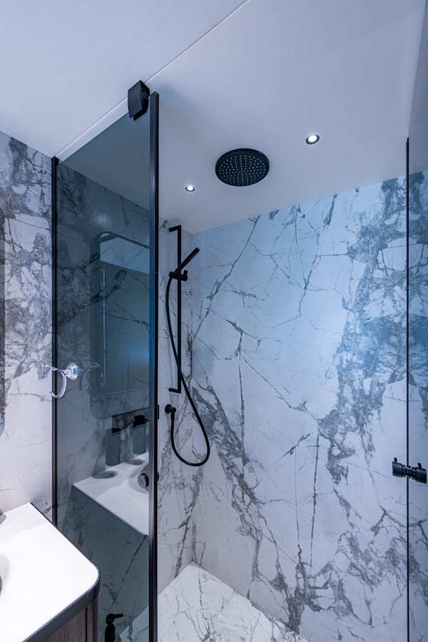 The Master Stateroom is spacious with its full beam configuration, huge windows, and king size bed, it also offers a leather seatee to stbd, Dual nightstands with hdmi and usb ports, a Samsung smart tv with sound bar, Fusion speakes and head unit ,full height cedar lined hanging locker, abundant storage throughout and luxurious head with beautiful stonework and a glass shower enclosure.