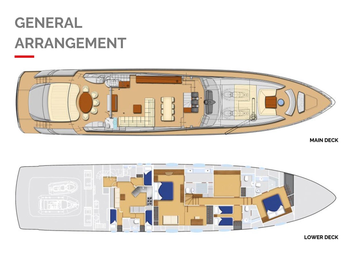 Designed by Fulvio De Simoni (exterior and interior), her sleek lines accentuate a sporty open‑yacht hull with a planing deep‑V form and teak decking. A lightweight GRP hull and superstructure help maximise performance. She features expansive sunpad areas on bow and flybridge, cockpit lounge with wet bar, plus a concealed hatch and garage housing a Williams tender and two Seadoos. Metallic “Anniversary Silver” paint adds refined aesthetics. Shallow draught (~1.8 m) offers access to secluded bays often favoured on Mediterranean cruising grounds.
