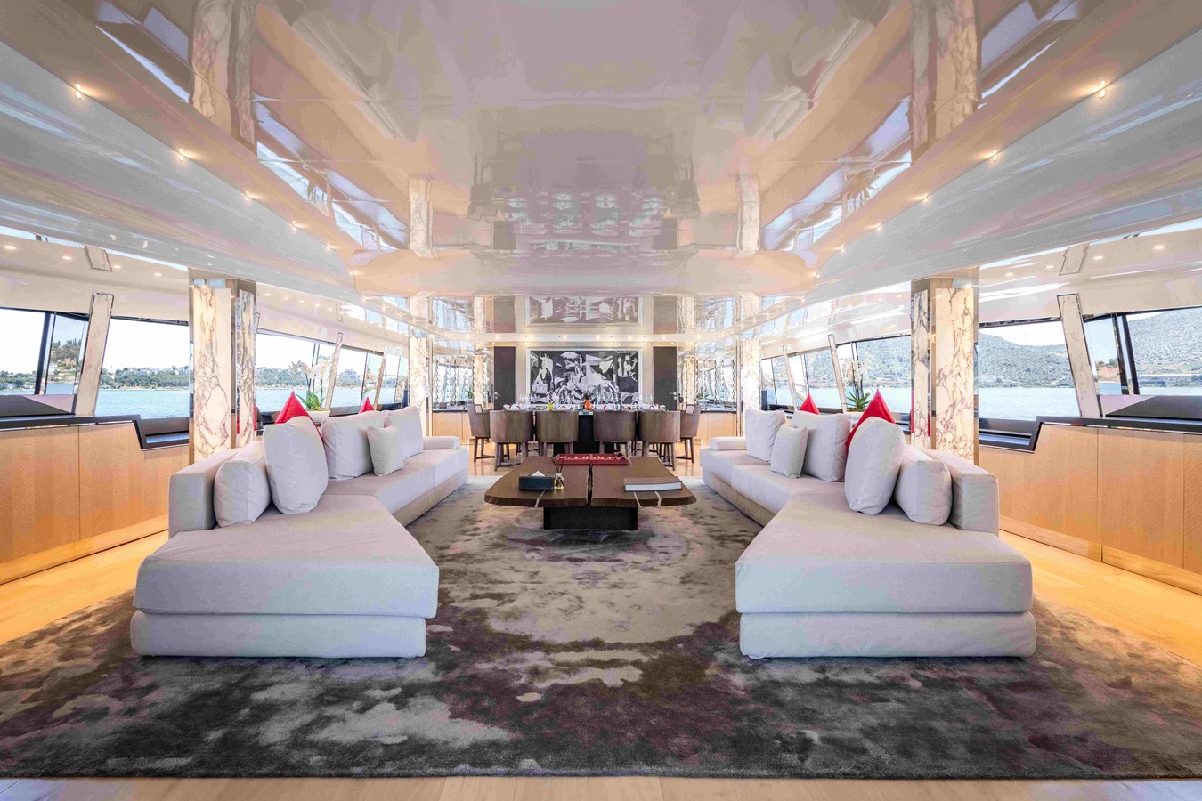She features a full-beam main saloon with lounge and dining areas, as well as a large sunbathing space on the foredeck. The upper deck includes a dedicated cinema room, while the flybridge provides seating for up to twelve guests for open-air dining, along with a bar area.