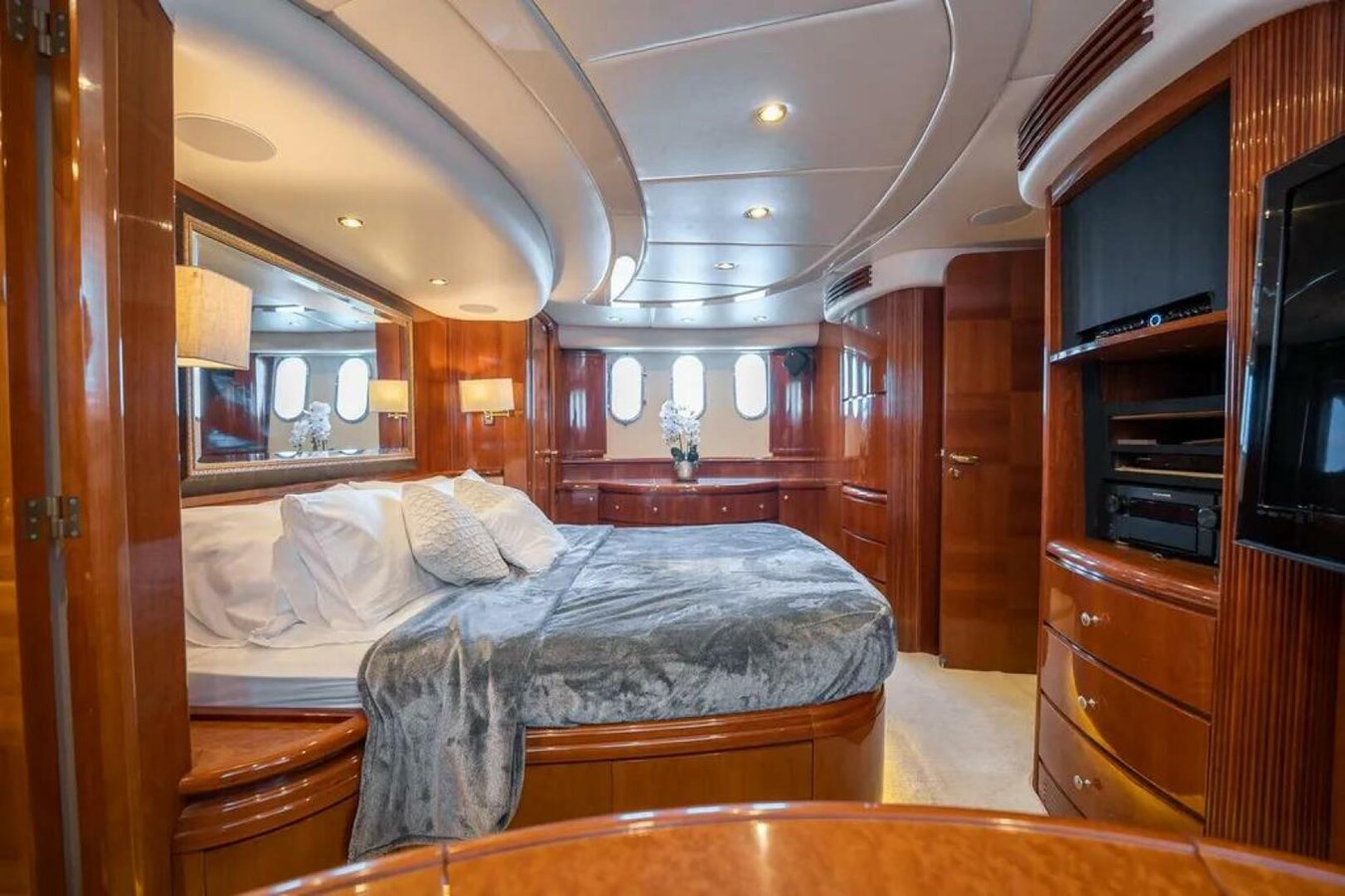 Cherry cabinetry, port, with Samsung flat-screen television on remote control lift