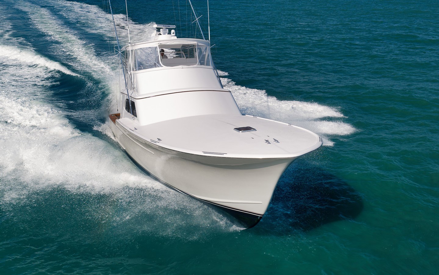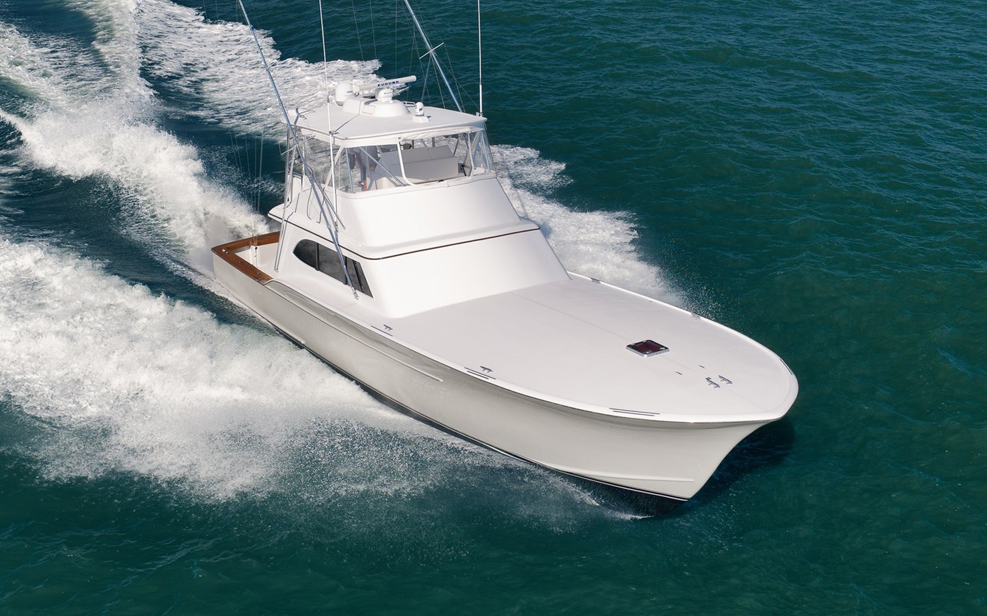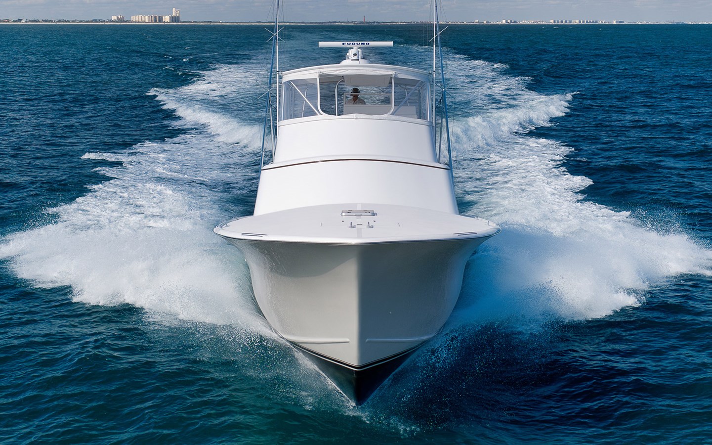 door is oriented slightly to starboard. The expansive bridge features a