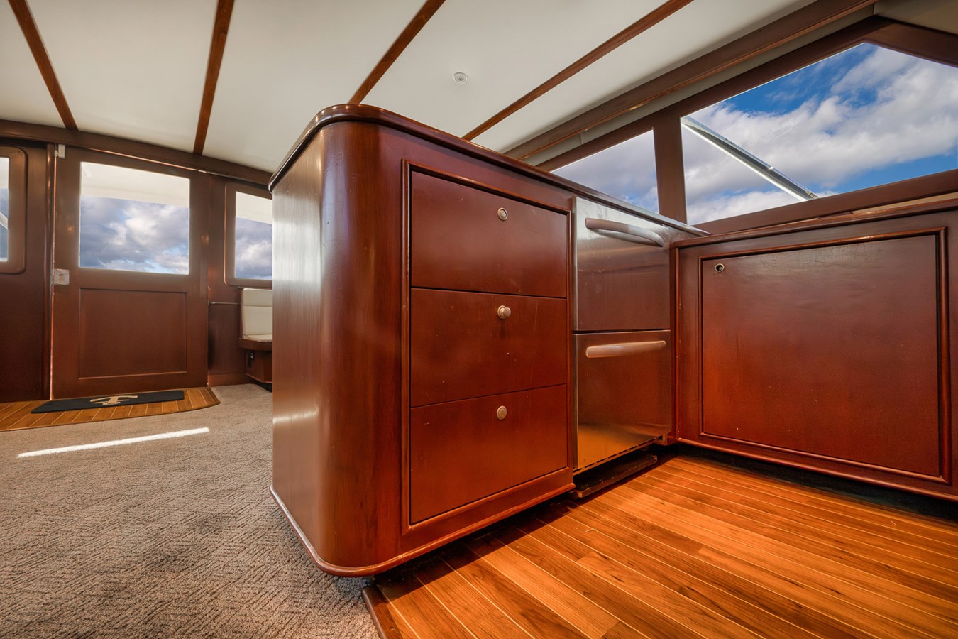 and forward of the helm. Fully carpeted salon with laminate Teak and