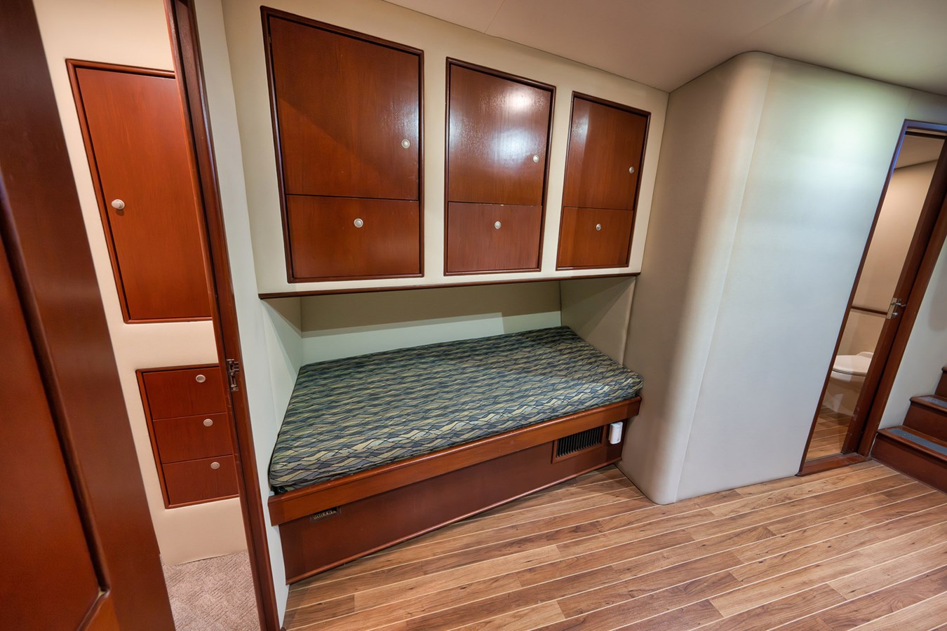 cabinets above. Against the aft bulkhead are over/under berths with a