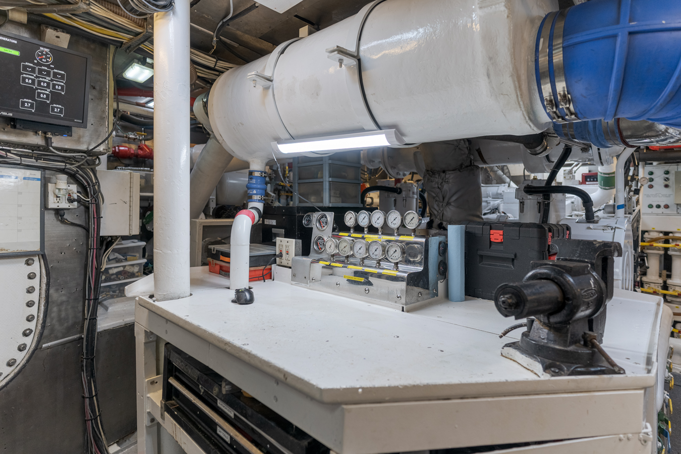 Fire Extinguishers: 30: Type ABC Size l, ll Dry Chem; Carbon Dioxide Fixed System: Ansul Halon 1301 (2) 300 lb. cylinders Distress Signals: Pains Wessex, Orion Smoke Alarm & Carbon Monoxide Detectors: Maretron Life Raft: (2) Viking 25 Person A Pack (non SOLAS) w/ Hydraulic Releases EPIRB: (1) ACR Satellite 406 RLB-32 Fire System: AC Pump w/ 5 Hose Stations