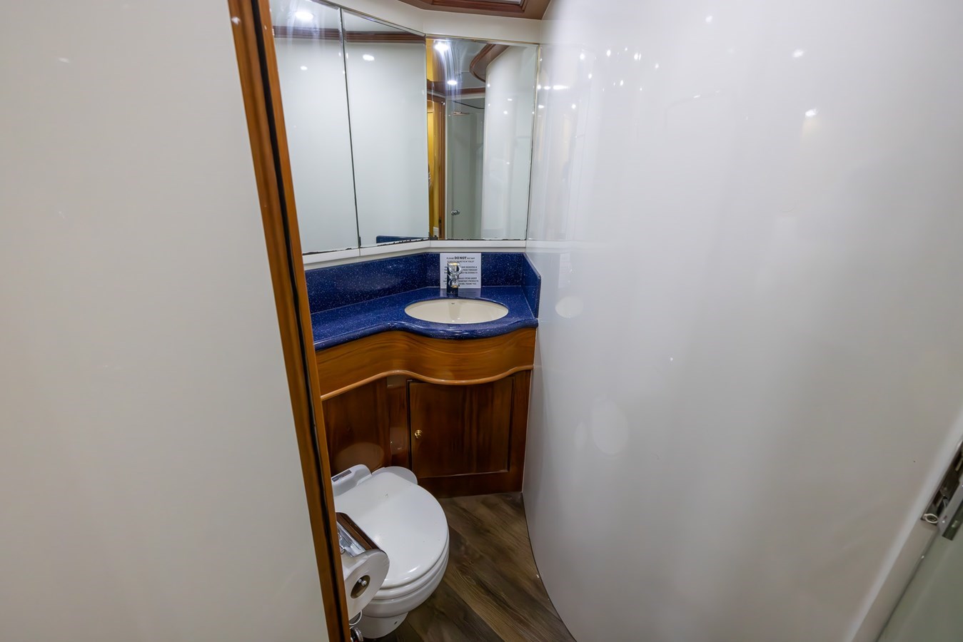 The aft deck has a large U-shaped dining settee and four loose chairs. It is fully covered and gives access to the wide walkaround side decks. Easy stairs access the flybridge. Centered electric doors open to the large salon with port and starboard couches, coffee tables, built-in cabinets and a room divider partially separating the eight place dining table. Forward to port is the enclosed galley with separate exterior access as well as a pocket door from the dining salon. Going forward to starboard is the yacht’s day head inboard, a side deck entry door outboard, the steps to the pilothouse, steps to below and furthest forward the beautiful on-deck master suite with plenty of windows and a large lower level head with his and her heads and a dual access shower between.
