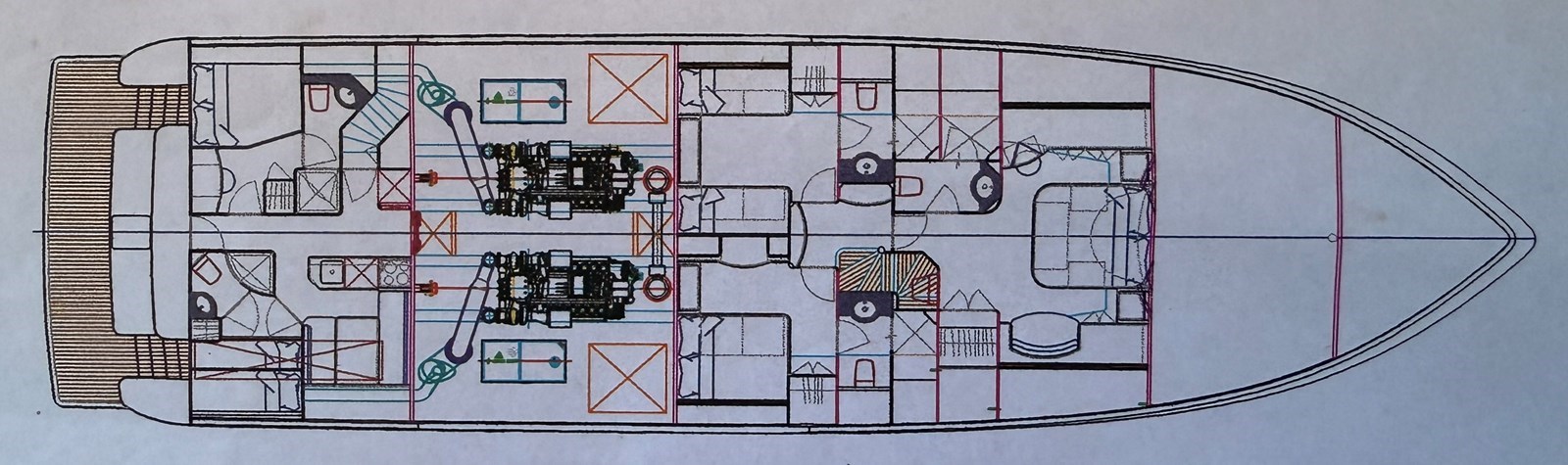 Forward below is a large VIP with a spacious head. Aft to starboard is an ensuite double berth cabin and to port an ensuite single lower berth cabin.