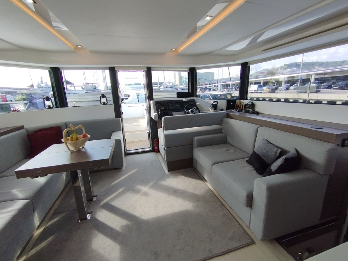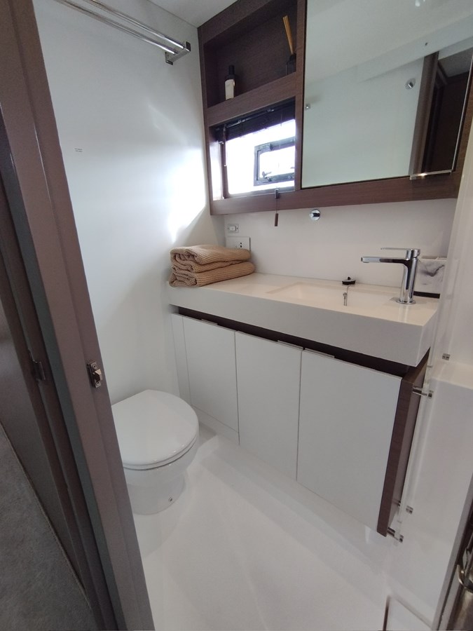 Performance is assured with twin Yanmar® 370 HP engines showing just 936 hours (starboard) and 934 hours (port) . Generator hours are equally low: Northern Lights® 12 kW at 1,001 hrs and Fischer Panda® PMS 10000i at 371 hrs . Combined with 2,100 L fuel and 700 L freshwater , Plan C offers long-range capability while consuming up to 50 % less fuel than comparable monohull yachts.