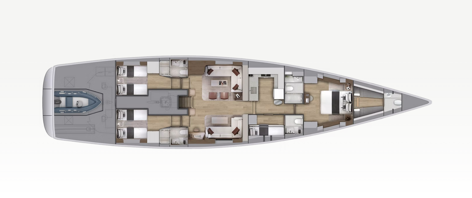 The spacious aft deck transforms into a luxurious retreat, perfect for Mediterranean summers. Below deck, the refined Mishi Concept interior elevates onboard living, proving that high-performance sailing and ultimate comfort can coexist.