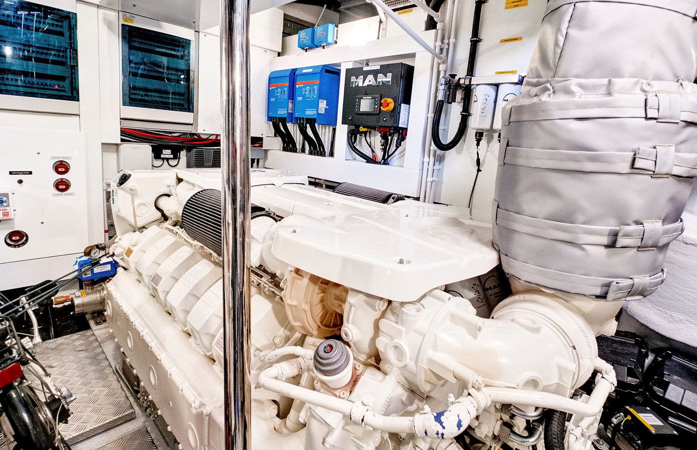 - Twin MAN V12-1550 engines with low hours