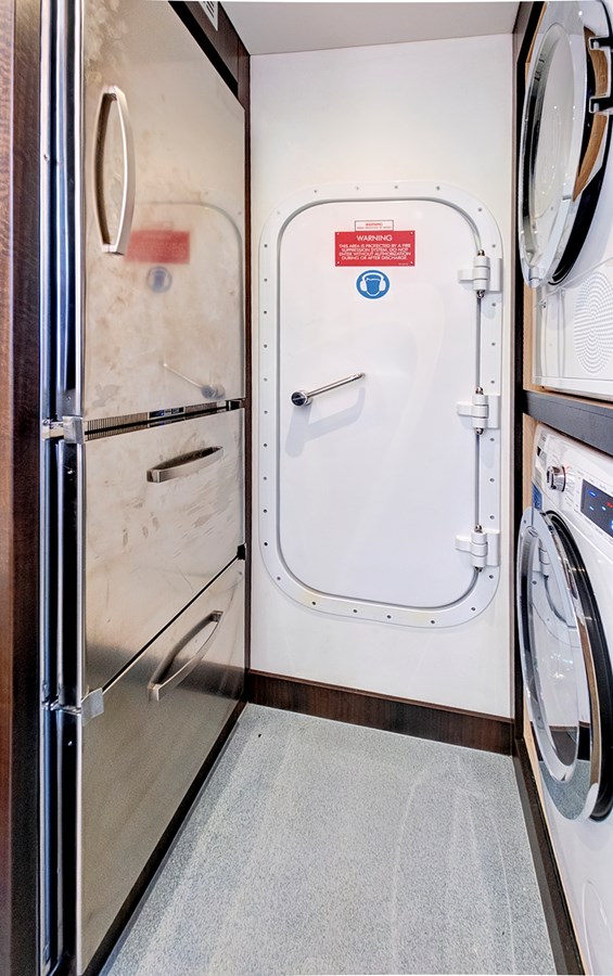 Her layout features four guest cabins plus a dedicated crew cabin , making her suitable for both private ownership and fully crewed operation. On the main deck, a spacious salon places the lounge area aft, with the dining area and galley forward, creating an open, fluid living environment and an efficient service flow. The expansive flybridge offers a superb outdoor setting equipped with a dining area, sunpads, a bar, and a helm station with elevated visibility.