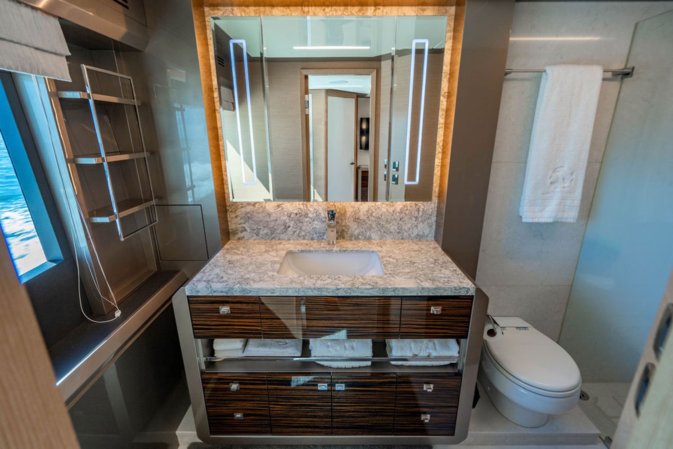 - Tecma™toilet system throughout with unique Ocean Alexander proprietary “Toilet lock out” system. Provides “lock out” of flushing when holding tank is full. Prevents accidental spillage or “blow back” often found on competitor yachts. Tankage status and alarm is standard via N2KView monitoring system.