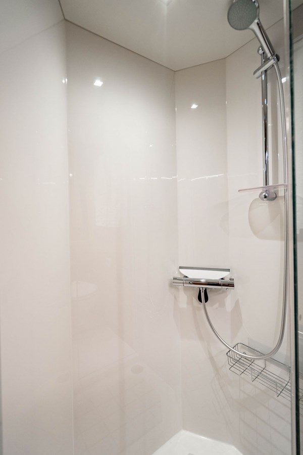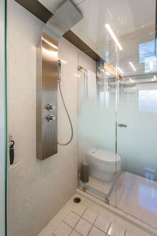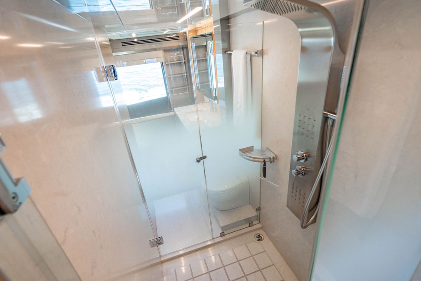 - Shower door shall use “crystal clear” glass custom made for Ocean Alexander. Providing superior transparency and reflectiveness. Together with custom made for Ocean Alexander “minimalist and transparent water strips” provides a unique Ocean Alexander proprietary “Crystal Shower”