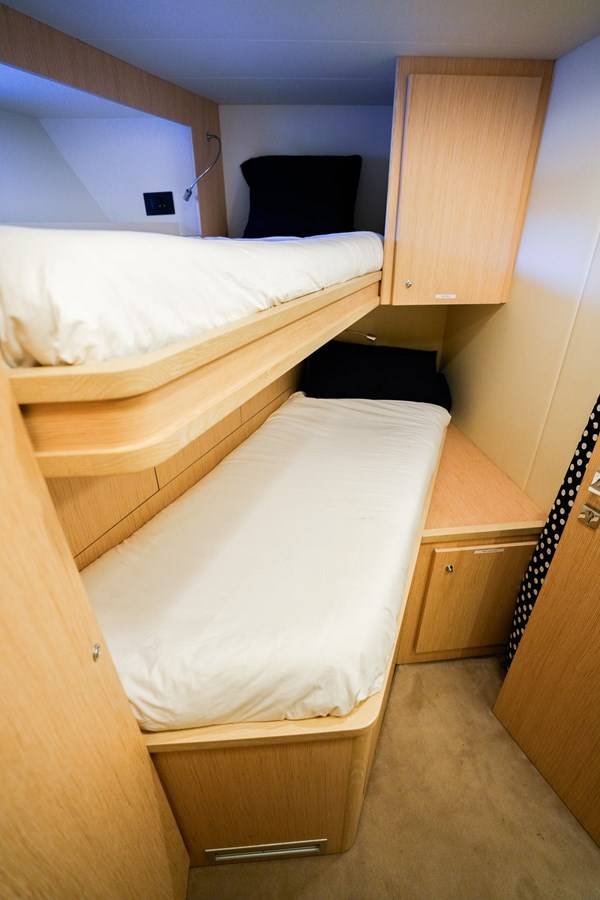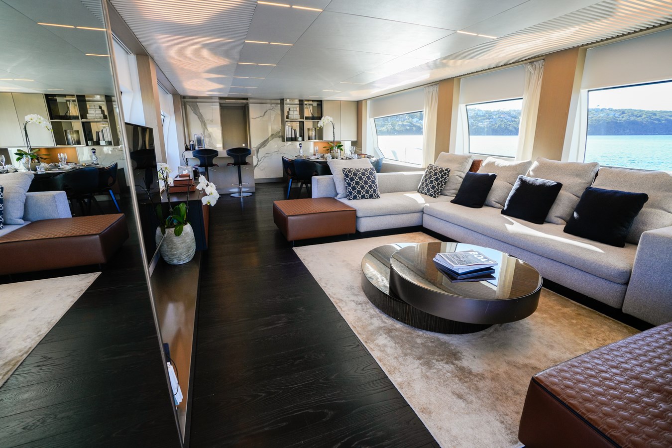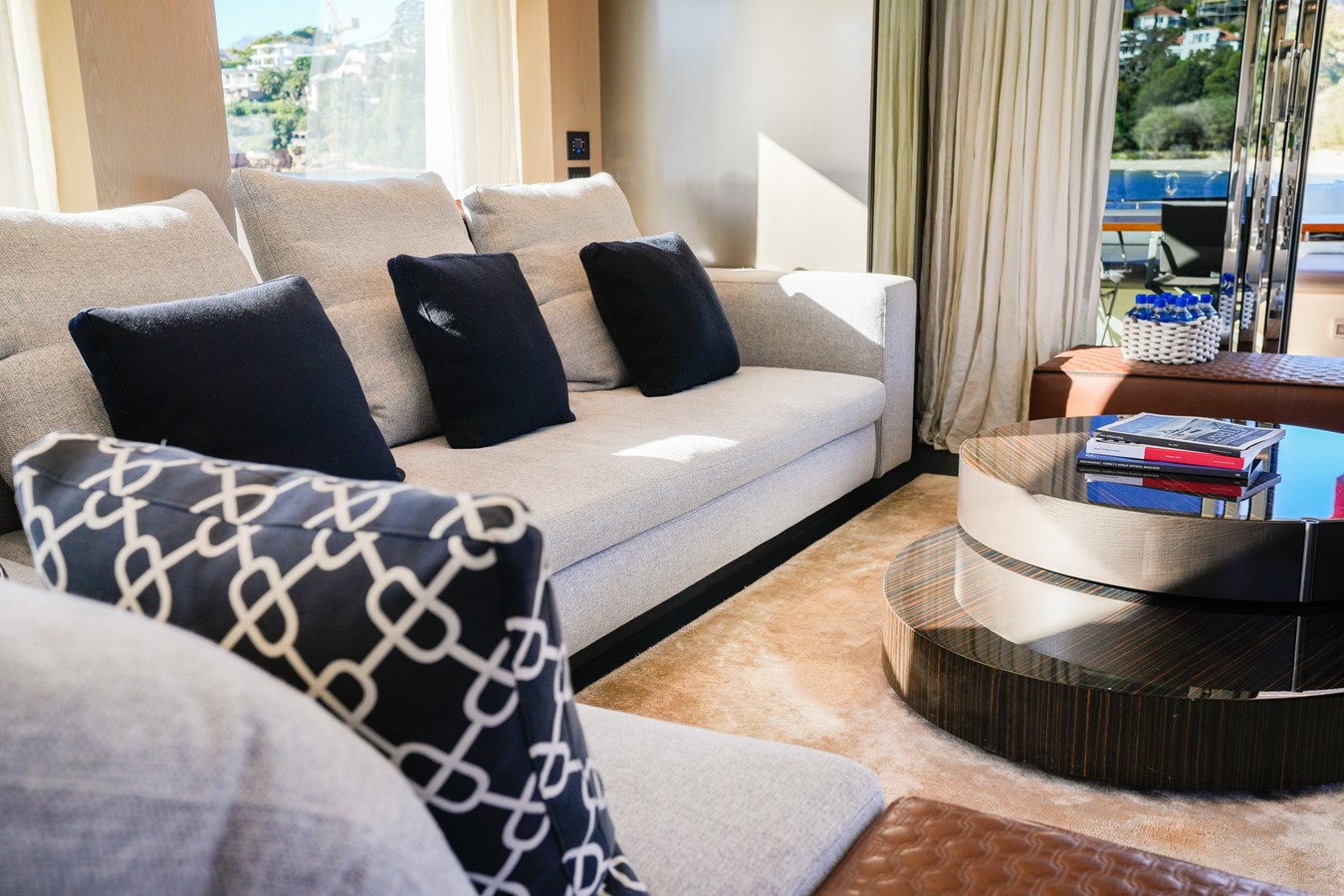 Her Zuccon-designed interior is elegant, contemporary, and bathed in natural light through oversized windows. The main saloon flows seamlessly from lounge to dining, with upgraded parquet flooring and a fully equipped bar. Accommodation includes 4 ensuite guest cabins for 8 guests, with a full-beam master suite featuring marble bathrooms, Minotti furnishings, leather dressing table, king-size bed, and extra storage. A further 2 crew cabins house 3 crew, ensuring discreet service. Details such as blackout blinds, electric curtains, washer/dryer units, wine cellar, and Siemens galley appliances add refinement and practicality.