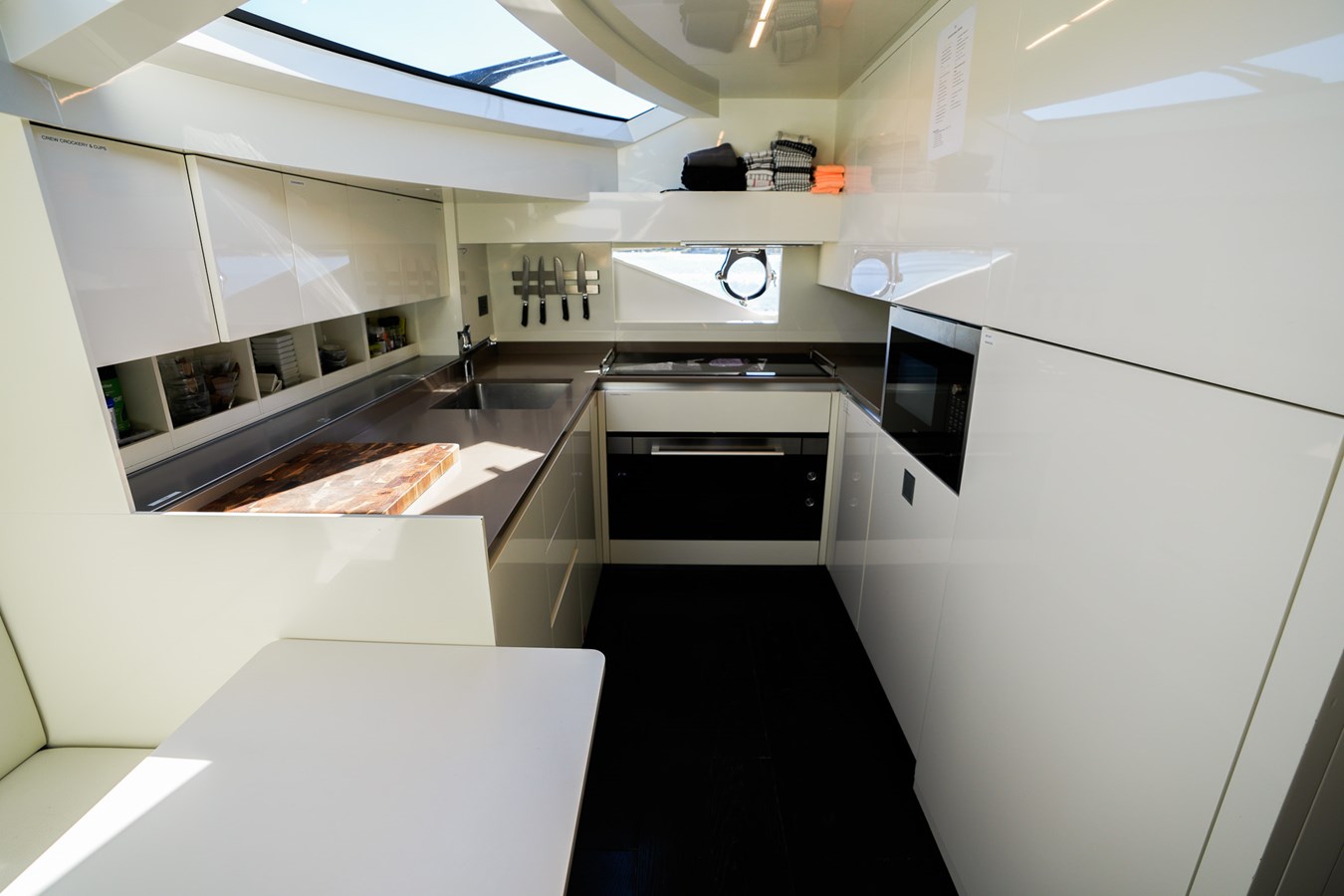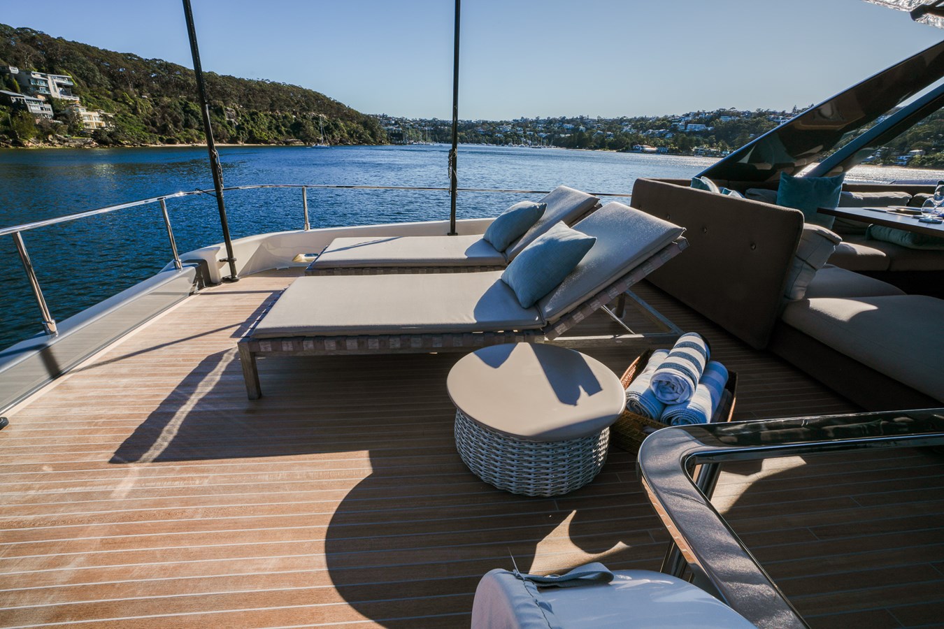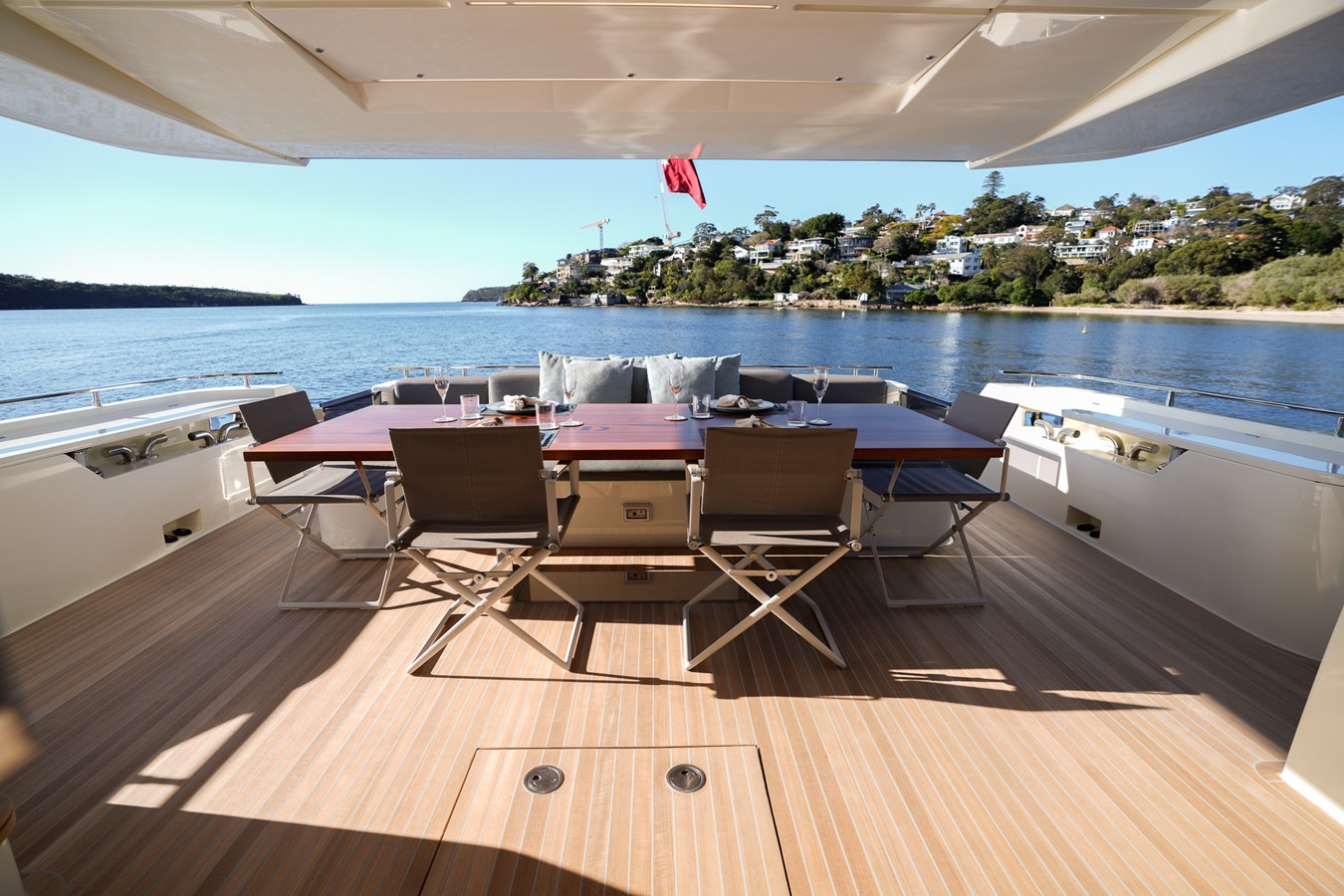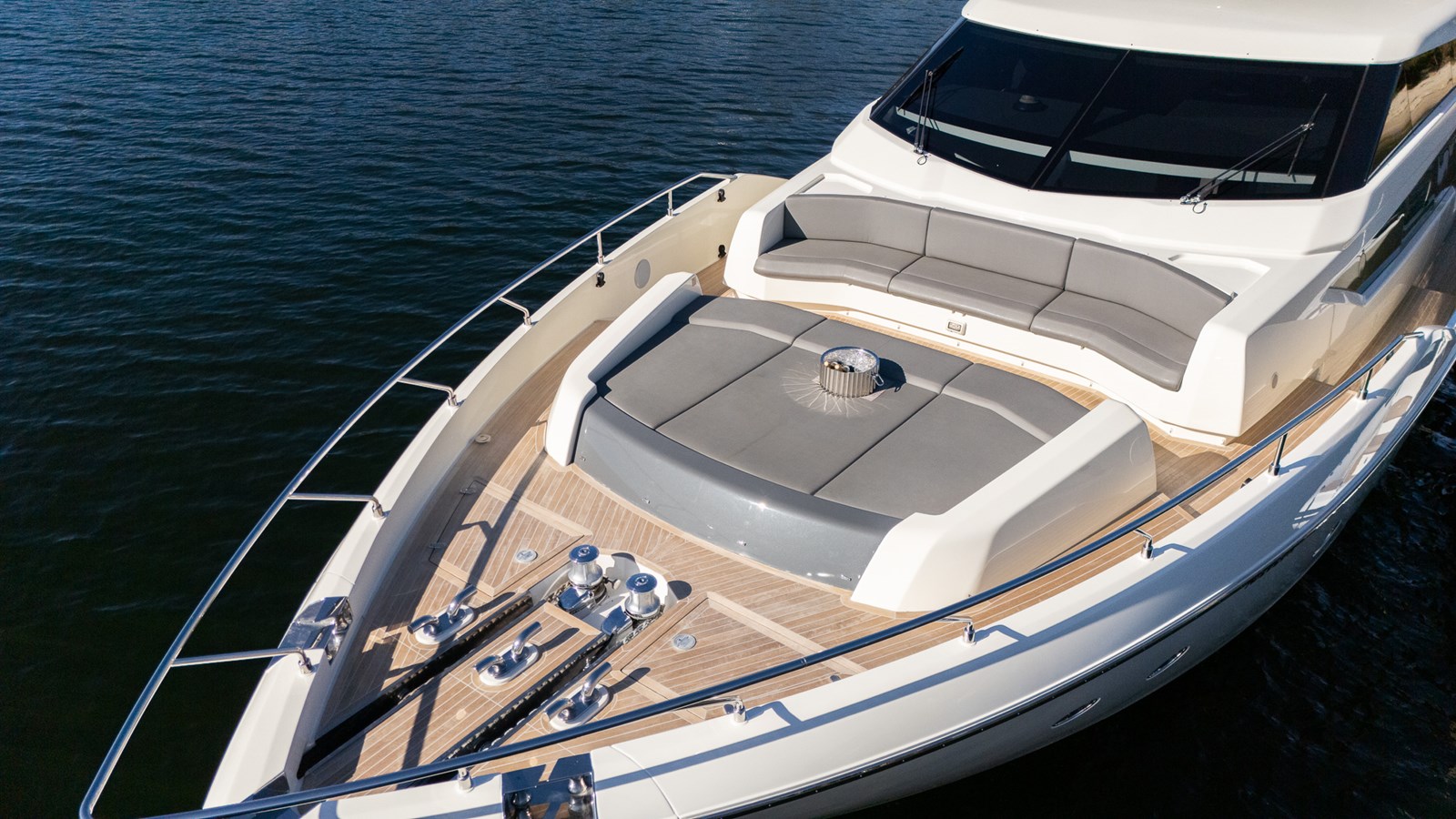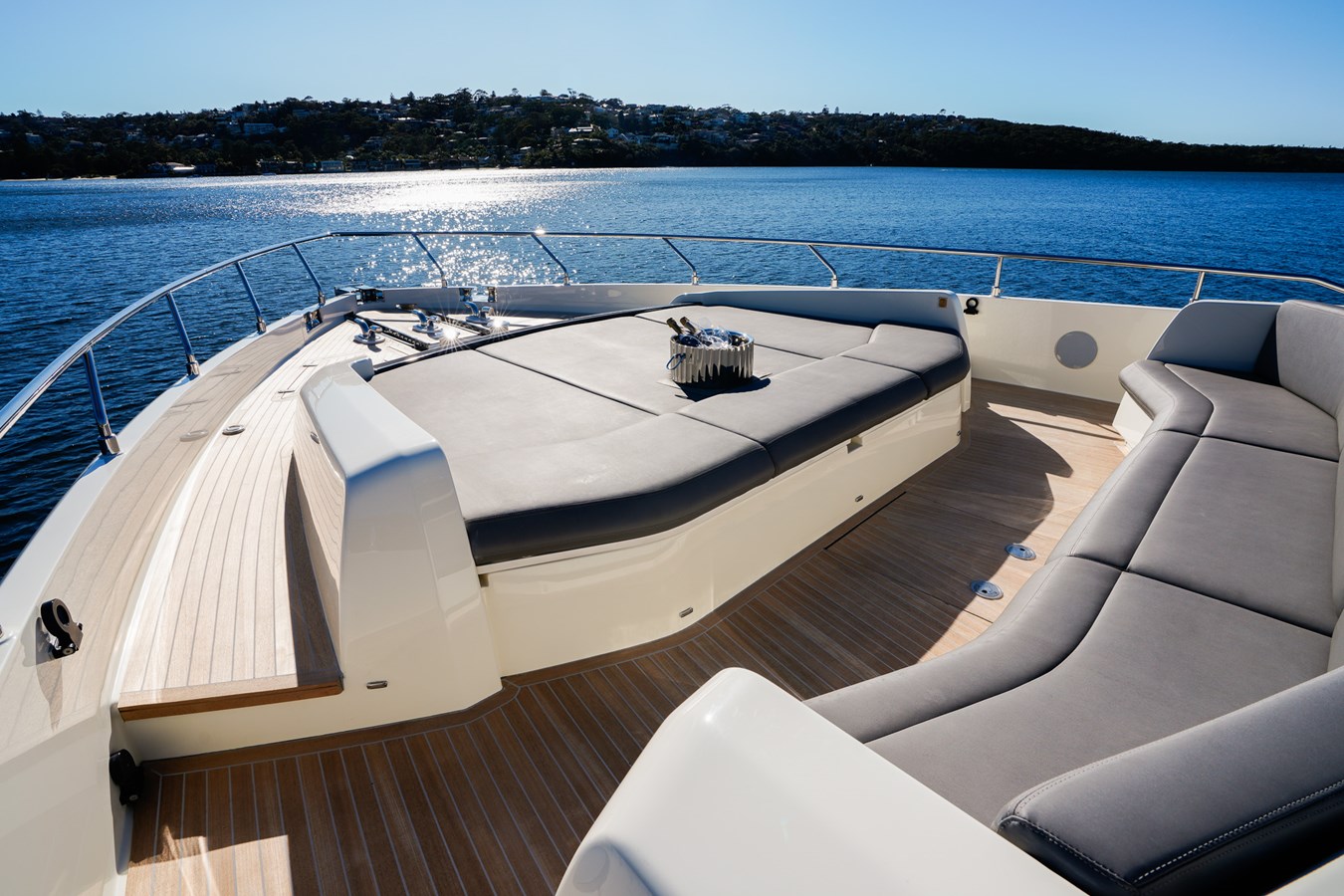 Outdoor living is maximised with a hardtop flybridge offering dimmable lighting, bar, dining, and sunpads. The bow provides a private retreat with sunlounges, while the aft cockpit and hydraulic swim platform deliver seamless access to the water. A tender launching system, underwater lights, retractable cleats, teak decks with grey caulking, and stainless swim handles elevate her lifestyle appeal.